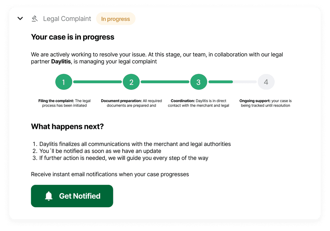 Our team is fully trained to mediate disputes with brands on your behalf. Whether it’s negotiating refunds, resolving conflicts, or escalating issues, we ensure you don’t have to face the process alone. Our mission is to secure the outcome you deserve.